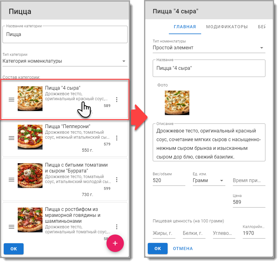 Пример того как выглядит карточка номенклатуры с модификаторами: