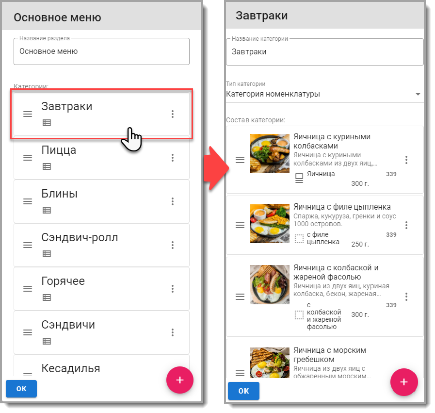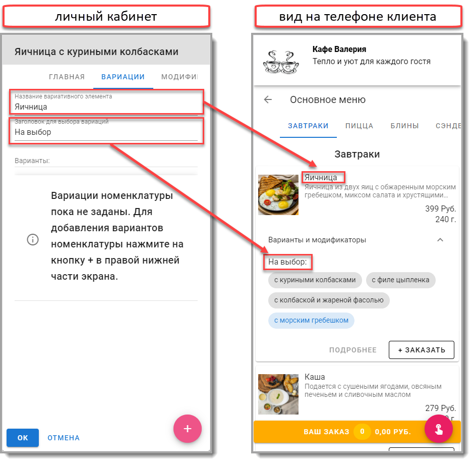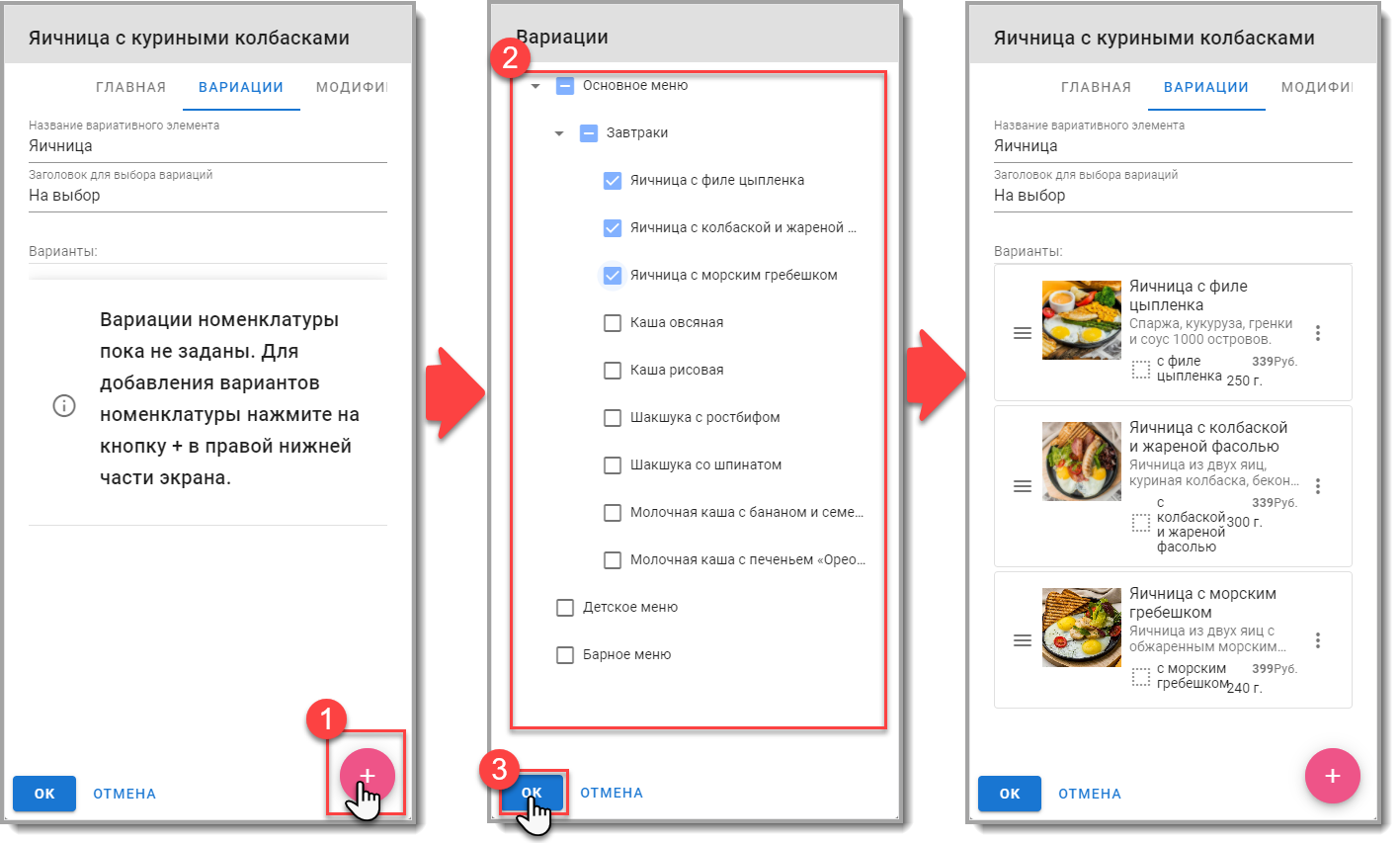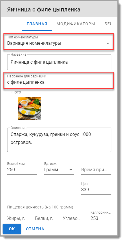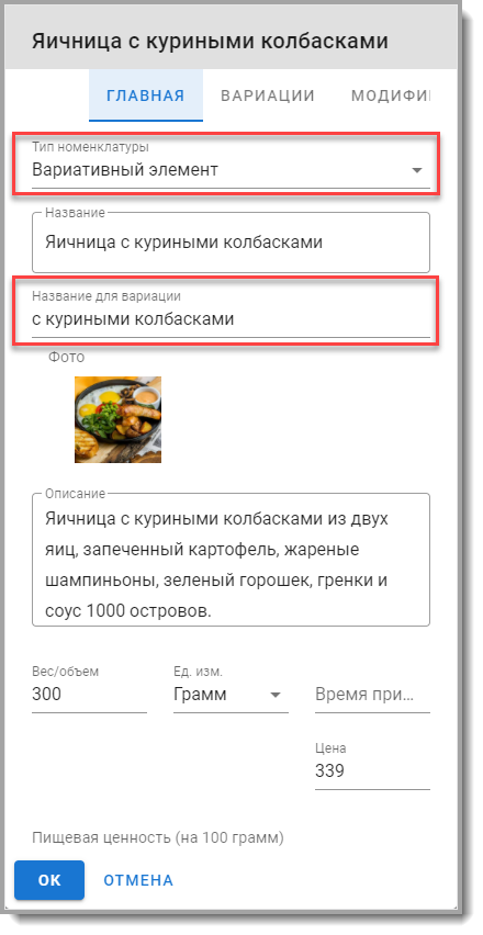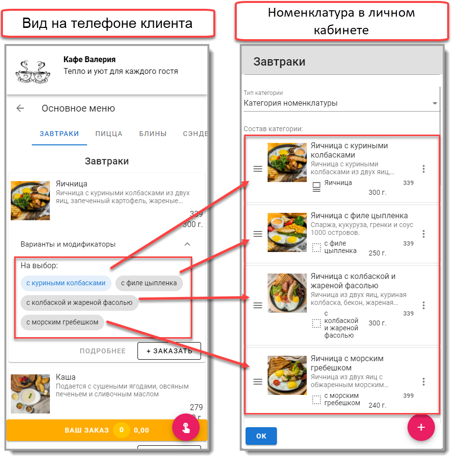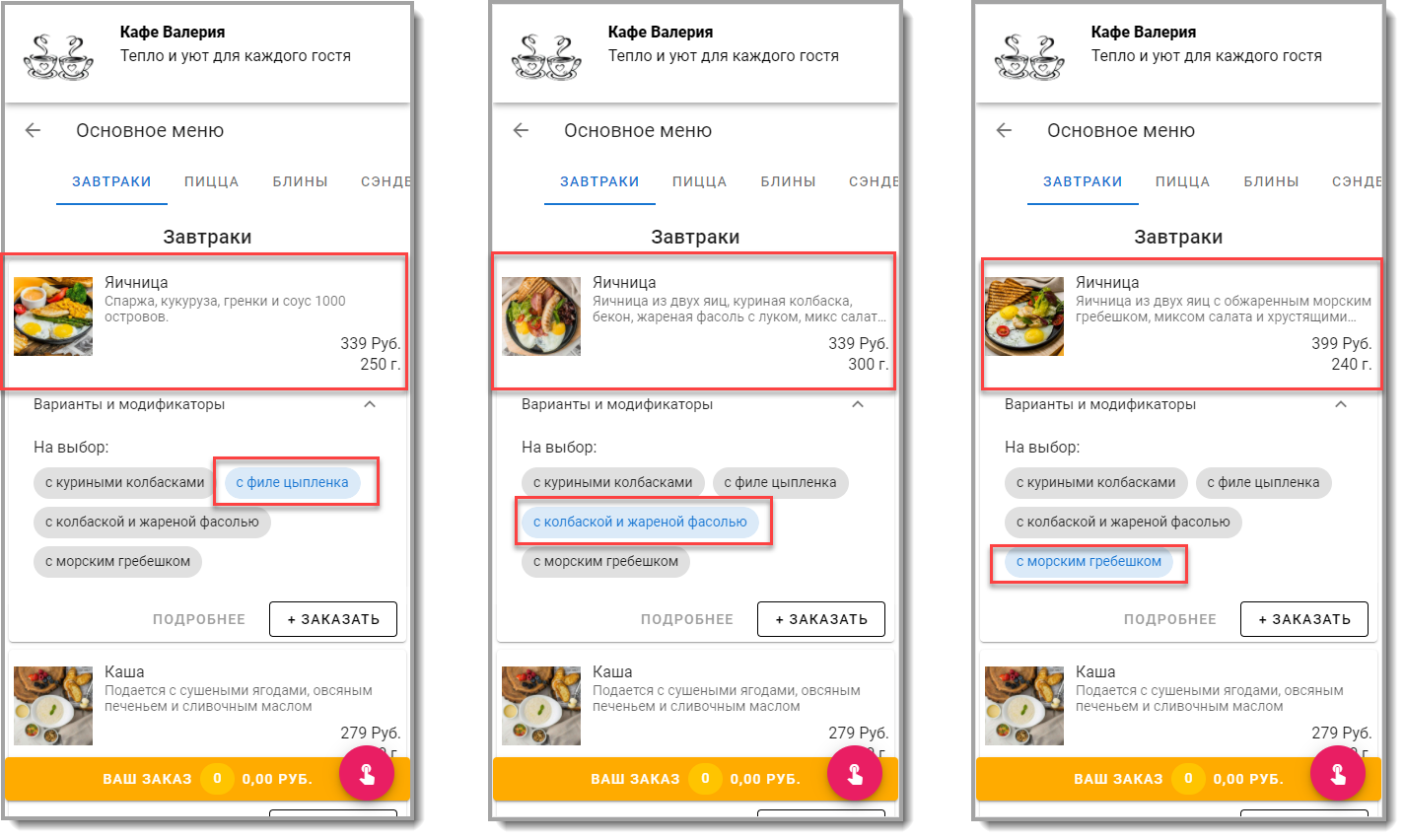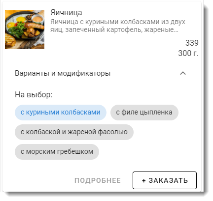 Вариативный тип номенклатуры дает клиентам удобный способ выбора блюд или товаров из нескольких однотипных позиций, как показано ниже на примере яичницы.