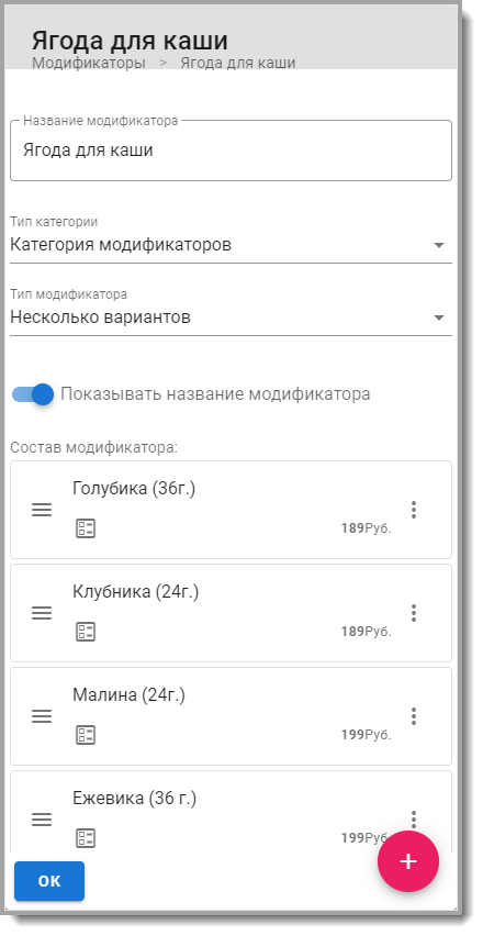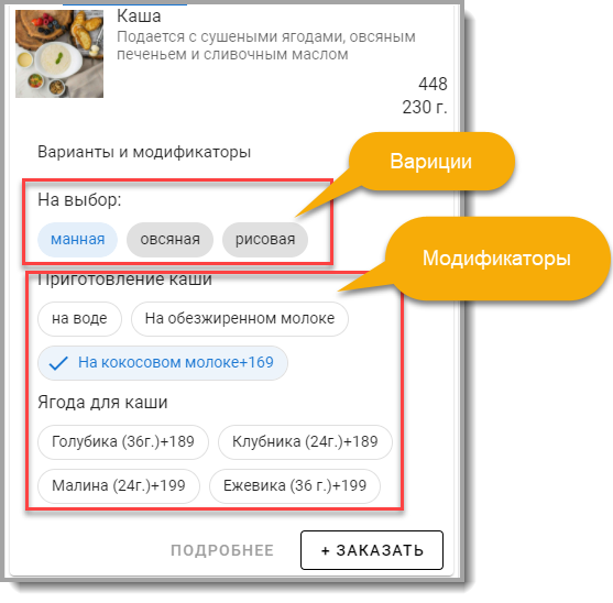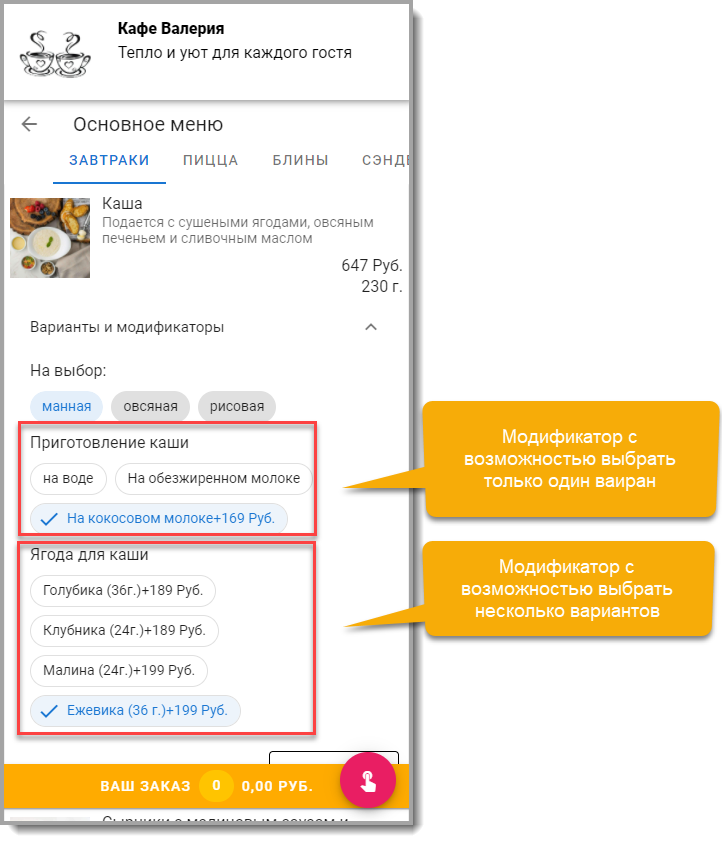 а если указан тип модификатора Один вариант то клиент сможет выбрать только один вариант из предлагаемых модификаций.