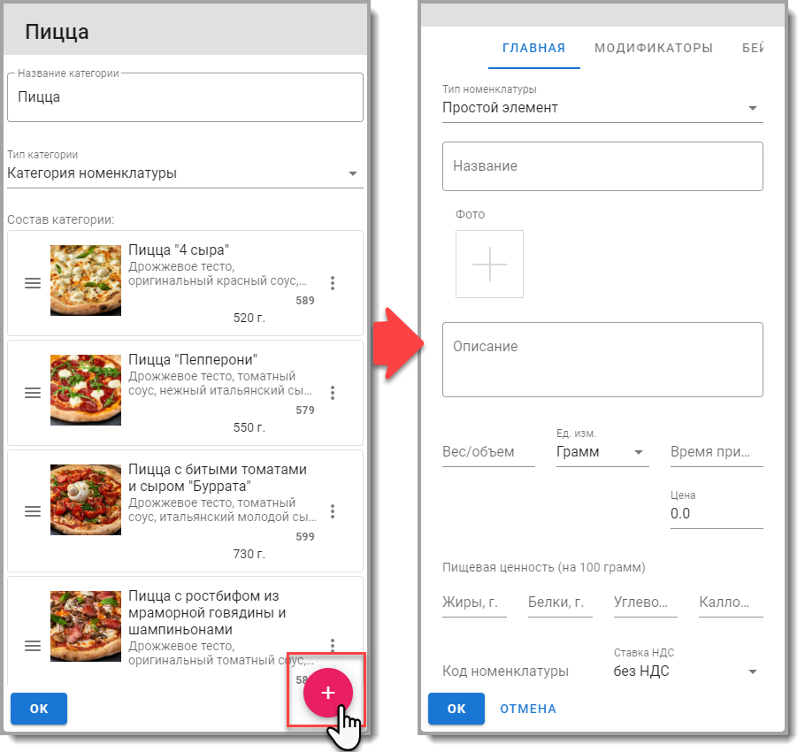 Для того чтобы добавить новую позицию номенклатуры (блюдо) нужно находясь в категории с типом
