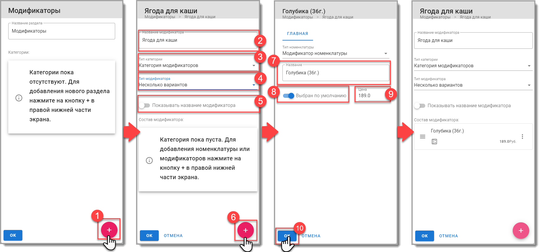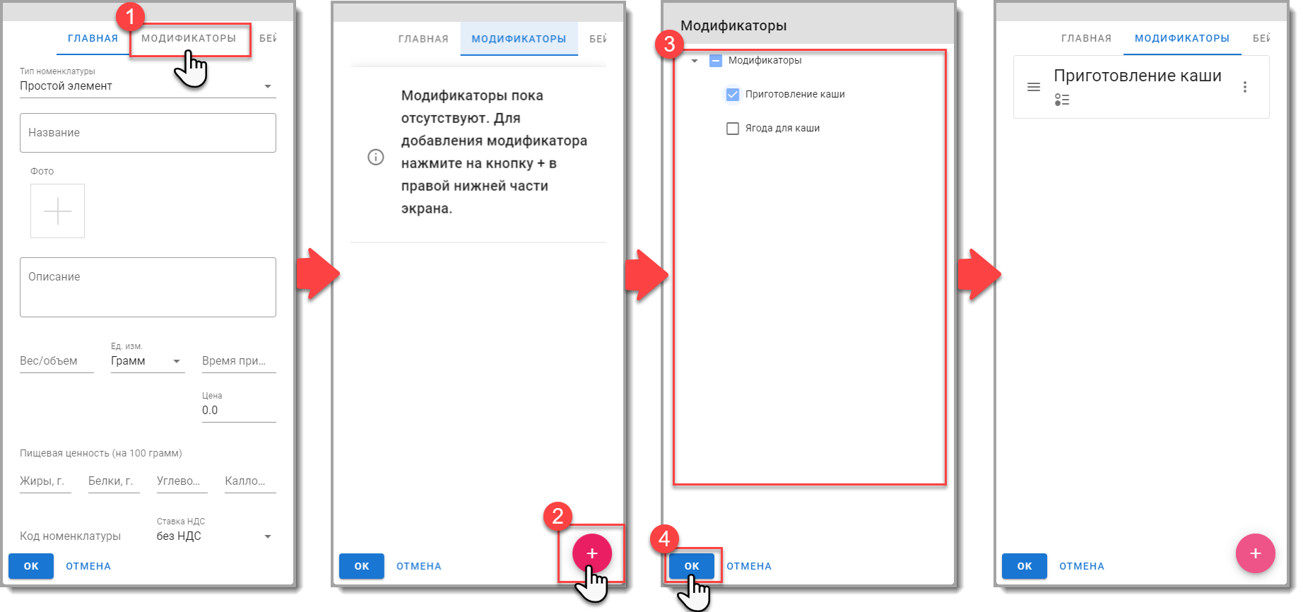 (как создавать модификаторы смотрите в разделе: Модификаторы номенклатуры)