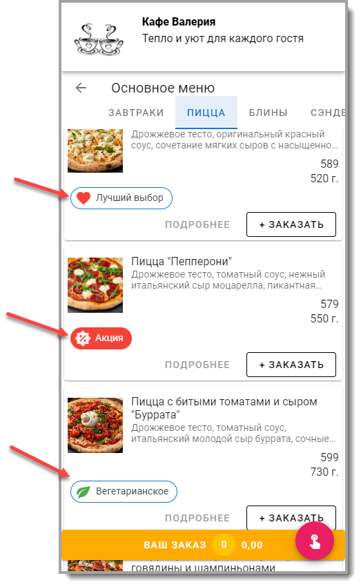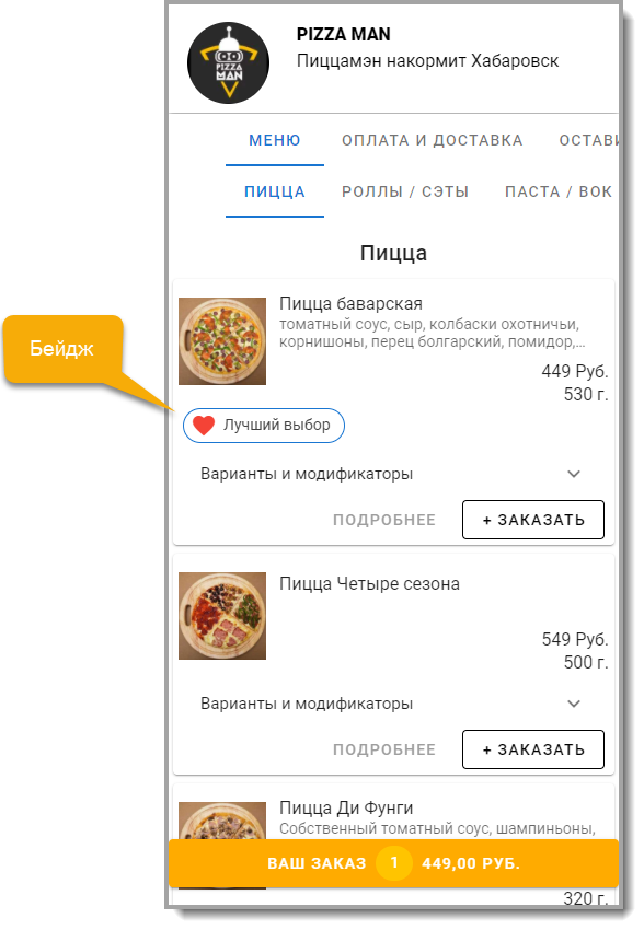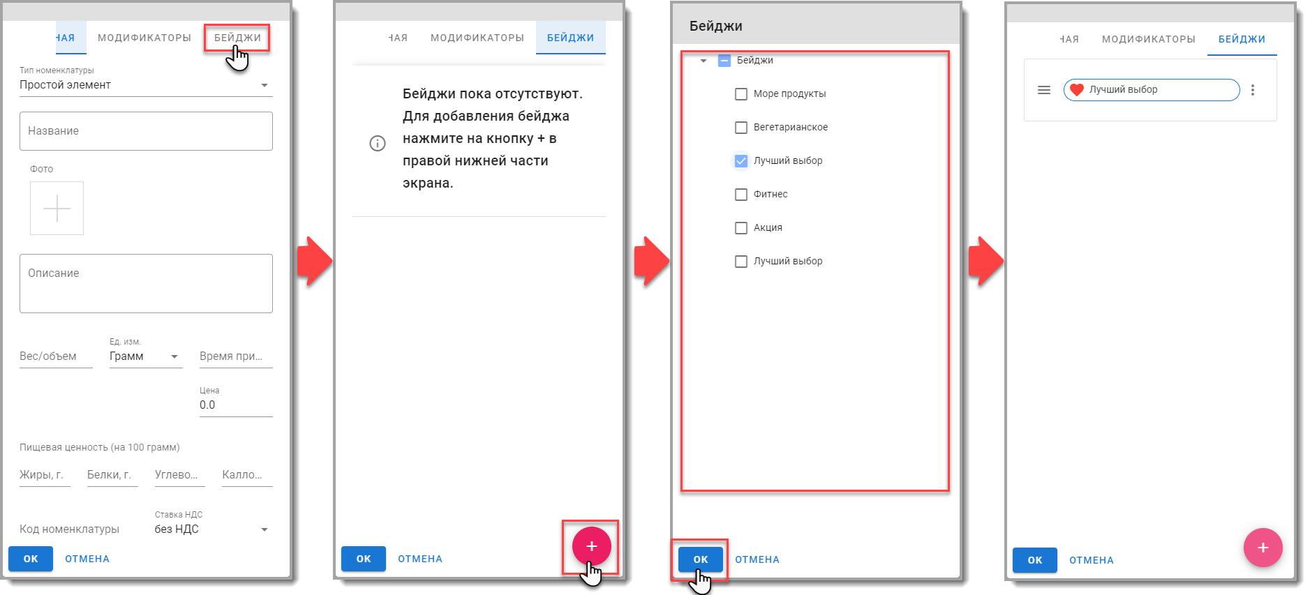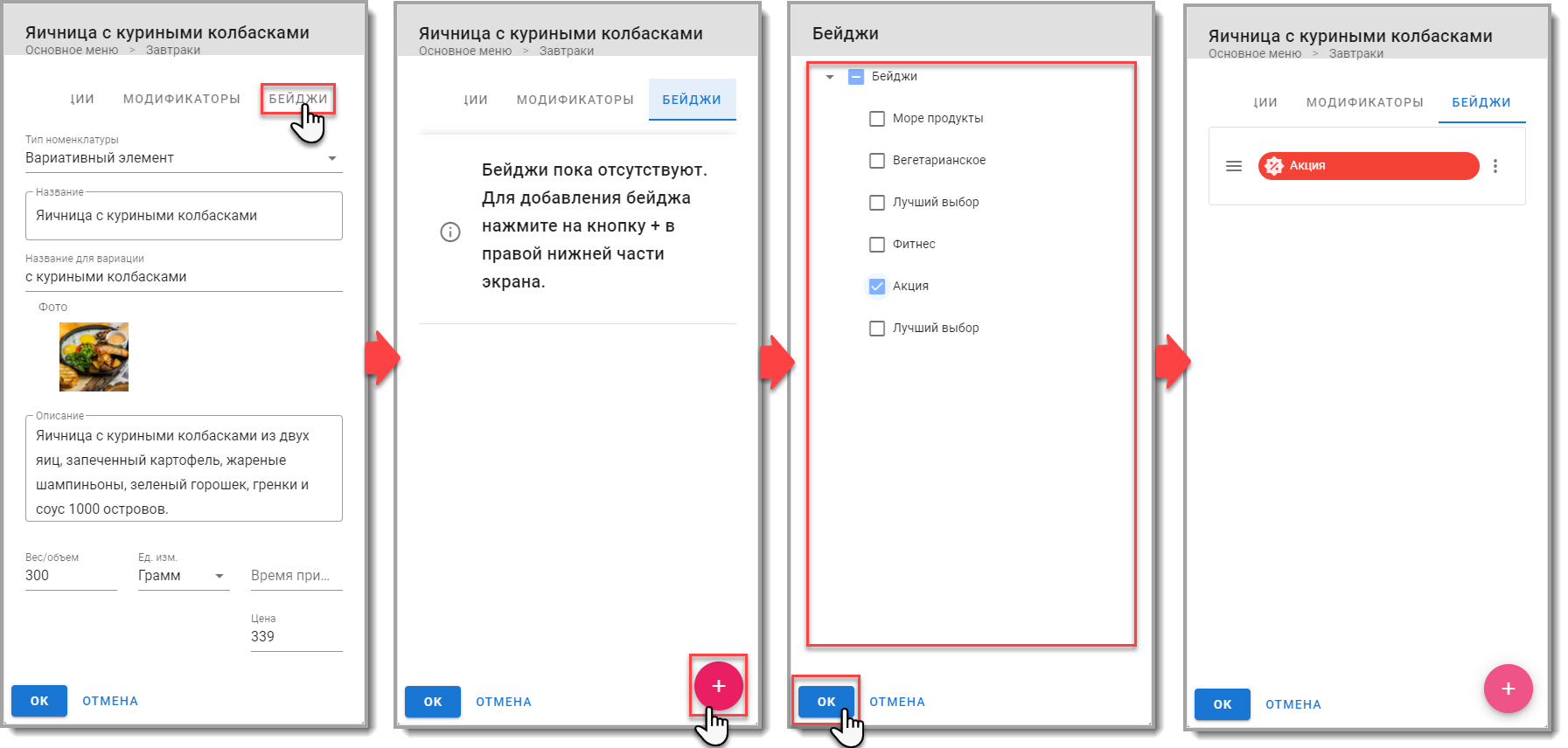 Бейджи служат для того чтобы визуально выделить карточку номенклатуры (блюда) и привлечь к ней внимание: