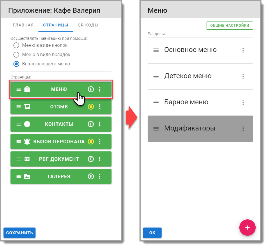 Для перехода к настройке Меню нажмите на карточку страницы со значком