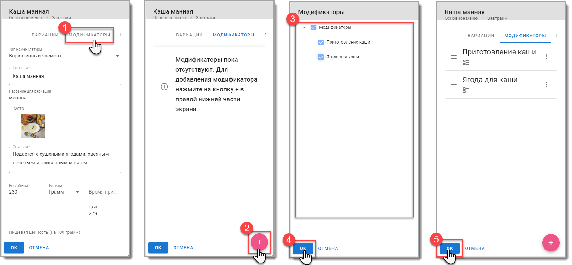 Модификаторы - это возможность добавлять к номенклатуре характеристики (особенности) которые могут изменять итоговую стоимость номенклатуры или блюда: