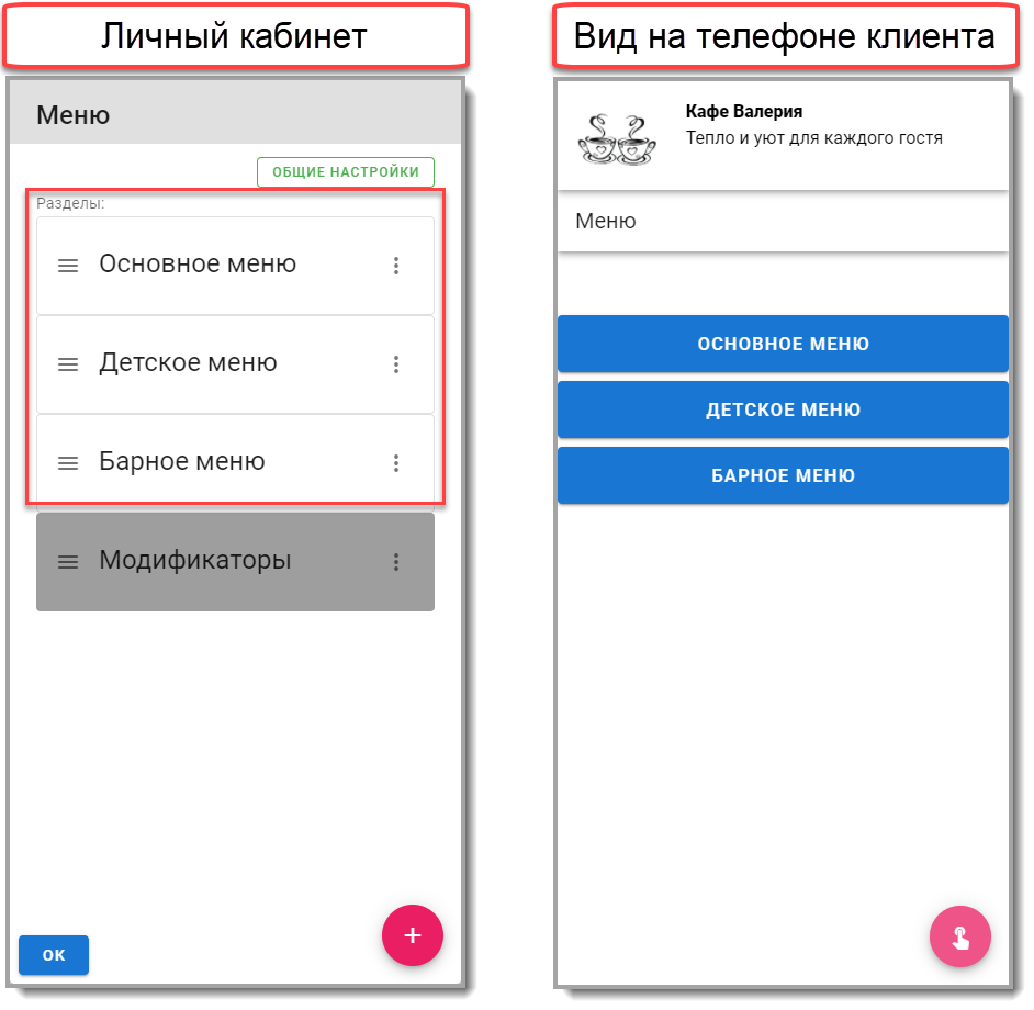 В клиентском приложении разделы отображаются в виде кнопок (как отдельные меню):