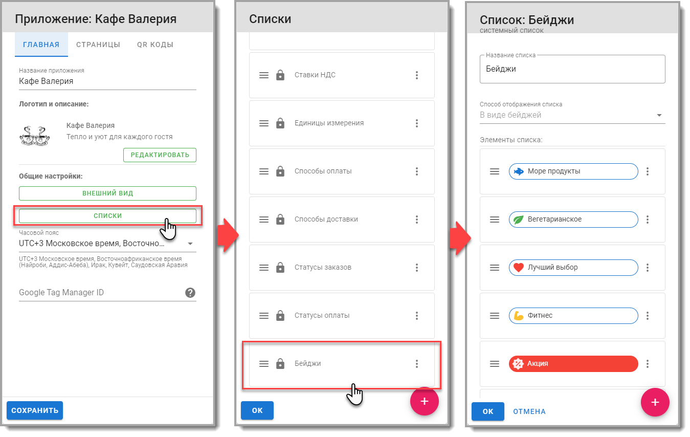 Управление списком бейджей осуществляется в разделе Приложения > вкладка Главная > Cписки > Бейджи