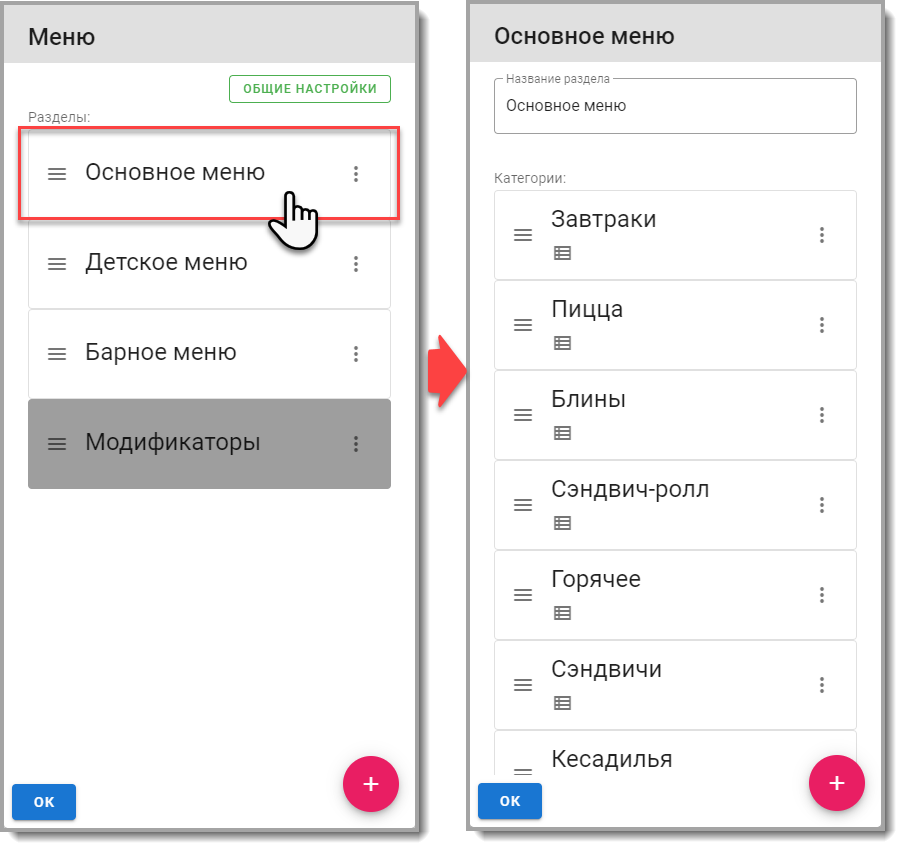 Для того чтобы изменить порядок отображения категорий (разделов меню) нажмите на значок
